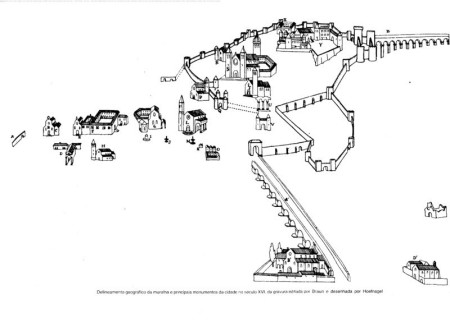 Coimbra als Nachzeichnung auf der Grundlage der beiden großen Städtekartographen Braun und Hogenberg. Mitte und rechts oben die Altstadt auf dem Hügel, mit dem Schloss der Könige und der alten Sé, die Kathedrale. Mitte unten das Stadttor zur Neustadt, unmittelbar dahinter der Palast Ripas. Eine der beiden Orte der geschilderten Tragödien. Auf der anderen Seite des Mondegos das Kloster, der zweite Ort. Die Brücke führt über den Mondego - Fluss.